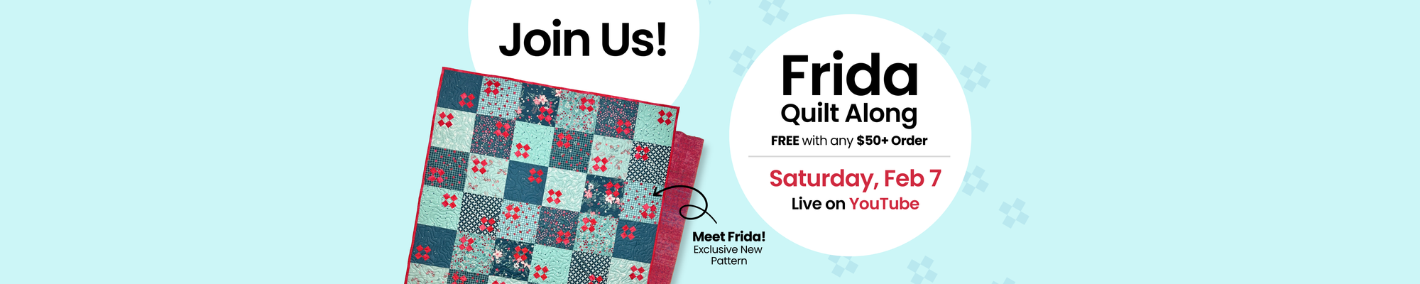There’s no sign-up or registration required for the Frida Quilt-Along—simply purchase the Frida pattern and video class and tune in live on YouTube on February 7 to quilt along with us!