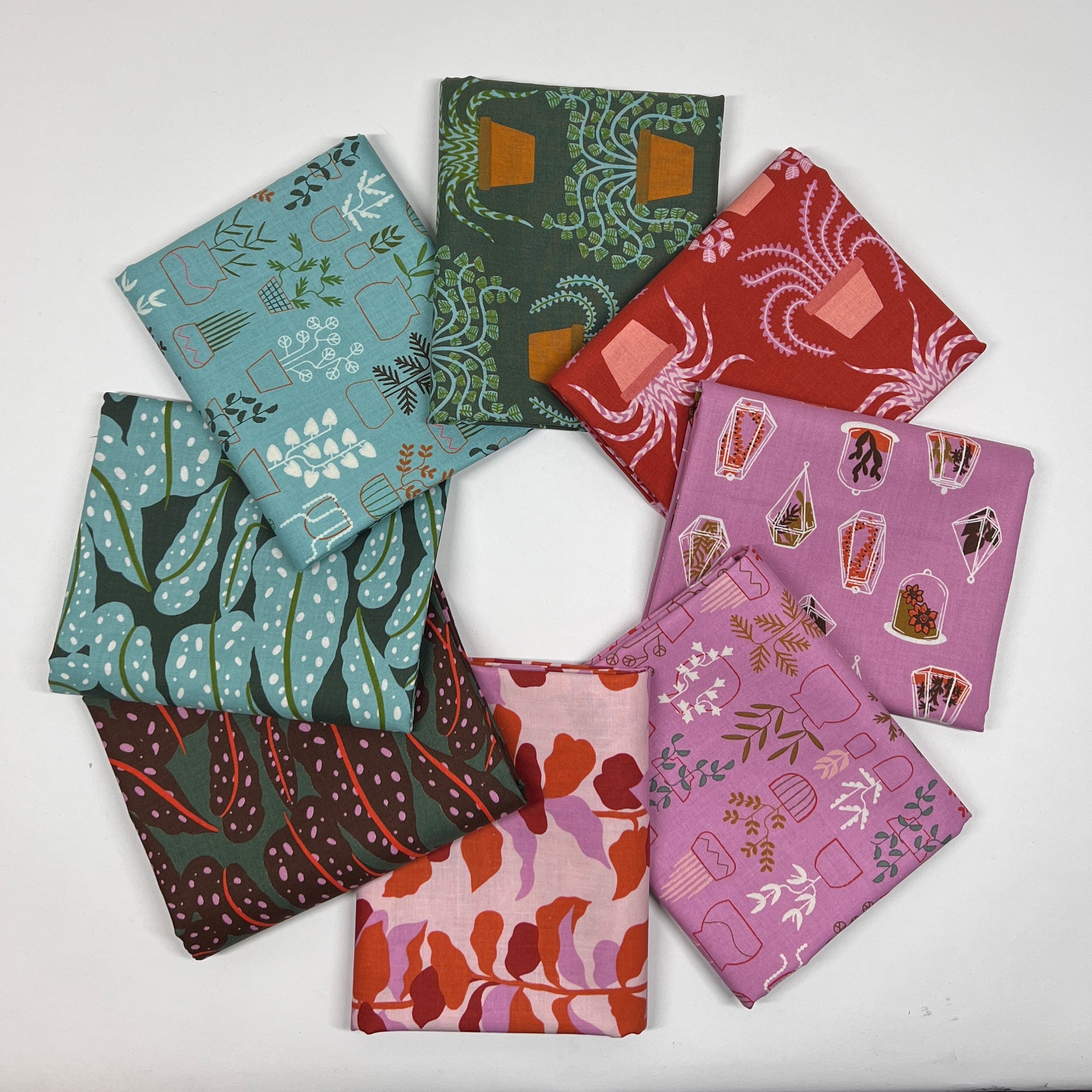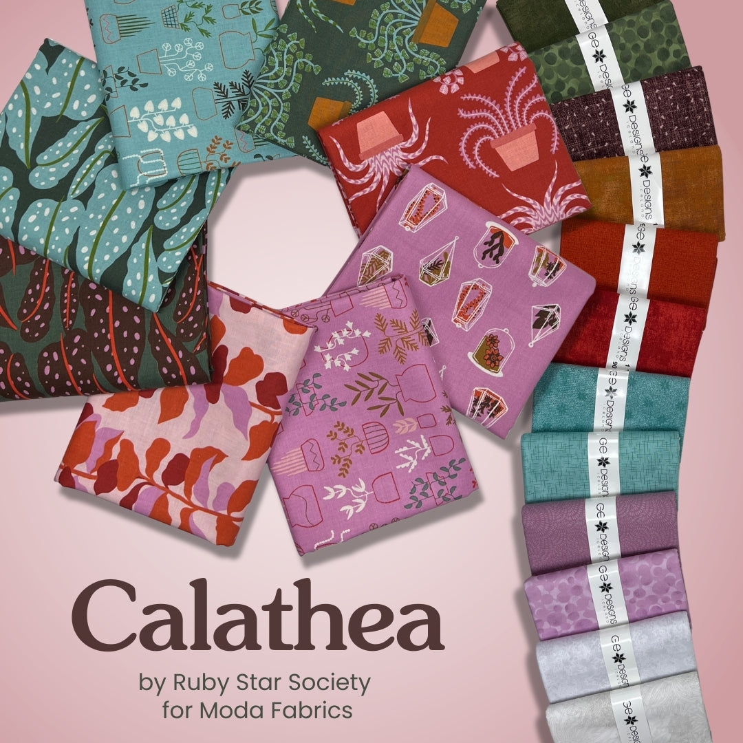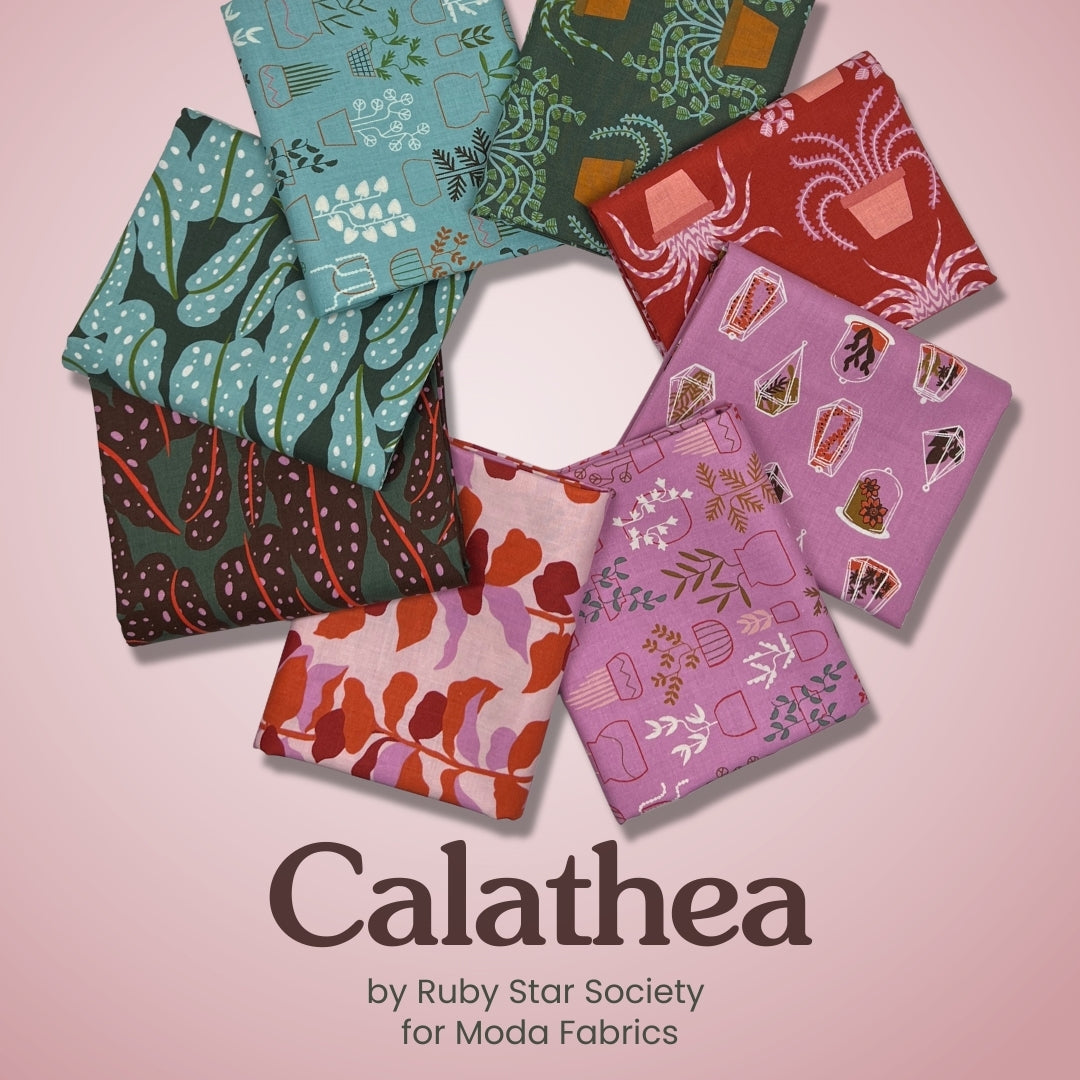 Bring bold botanicals and modern color to your next project with the 8 piece Calathea Half Yard Bundle from Ruby Star Society for Moda Fabrics. Inspired by lush houseplants and organic shapes, this collection features playful foliage, abstract motifs, and signature Ruby Star charm in a rich, curated palette of teals, greens, pinks, reds, and warm accents.