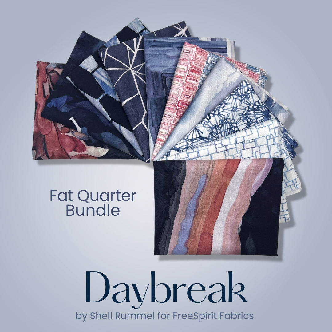 Inspired by the quiet beauty of early morning light, Daybreak by Shell Rummel features soft watercolor textures, layered brushstrokes, and modern geometric elements, with a sophisticated palette of inky blues, misty grays, soft blush, and warm neutrals that captures the calm transition from night to day. This 10 piece fat quarter bundle offers a beautifully coordinated selection of prints