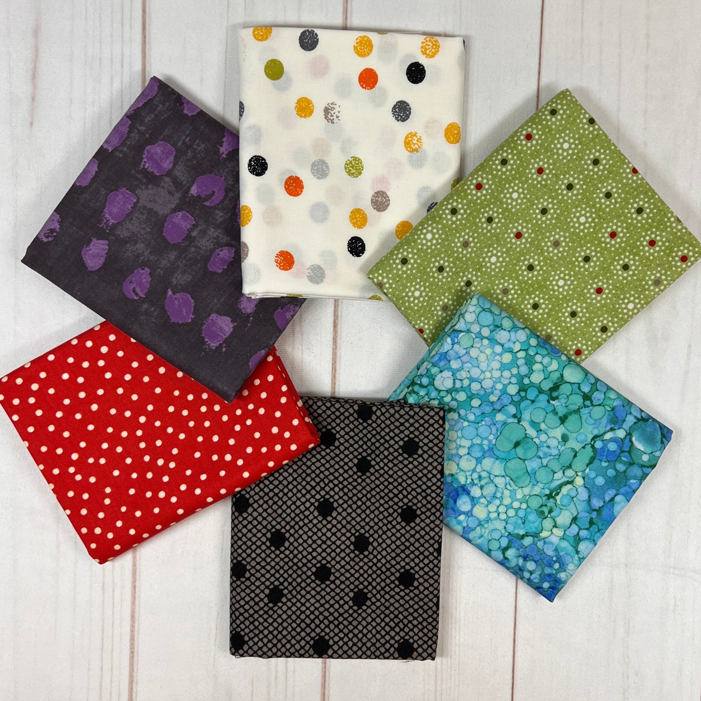 Six different 1/2 yard cuts of Dotted fabrics, but a total mystery as to what you will get. Still our great quilt shop quality fabrics, just leftovers from previous bundles. 3 yards total. Great Stash builder.