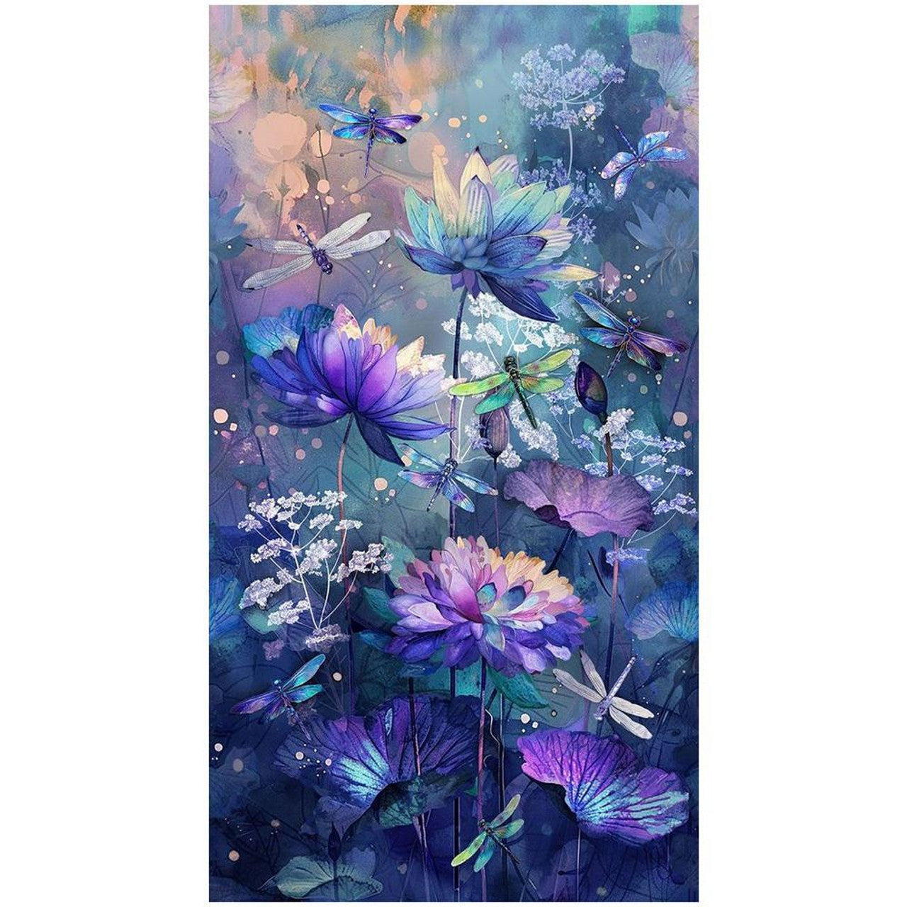Bring a little magic to your next project with the Dragonfly Mist Panel from the Dragonfly Mist collection by Timeless Treasures. This dreamy panel features luminous dragonflies drifting through a misty pond garden of layered lotus blooms and floating leaves in rich jewel tones—think twilight blues, soft purples, and hints of shimmering aqua. The watercolor-style artwork creates incredible depth and movement, making it a stunning focal point all on its own.