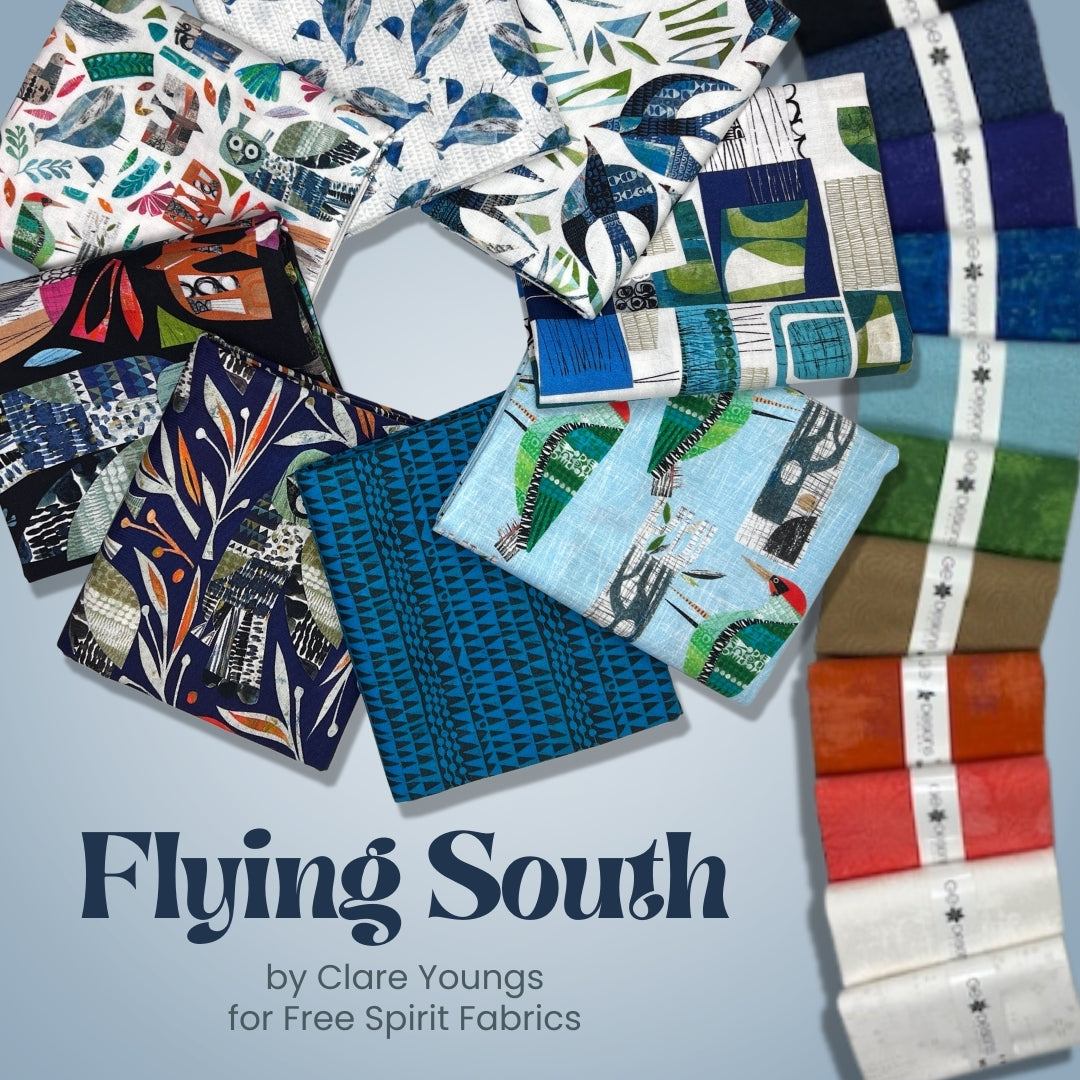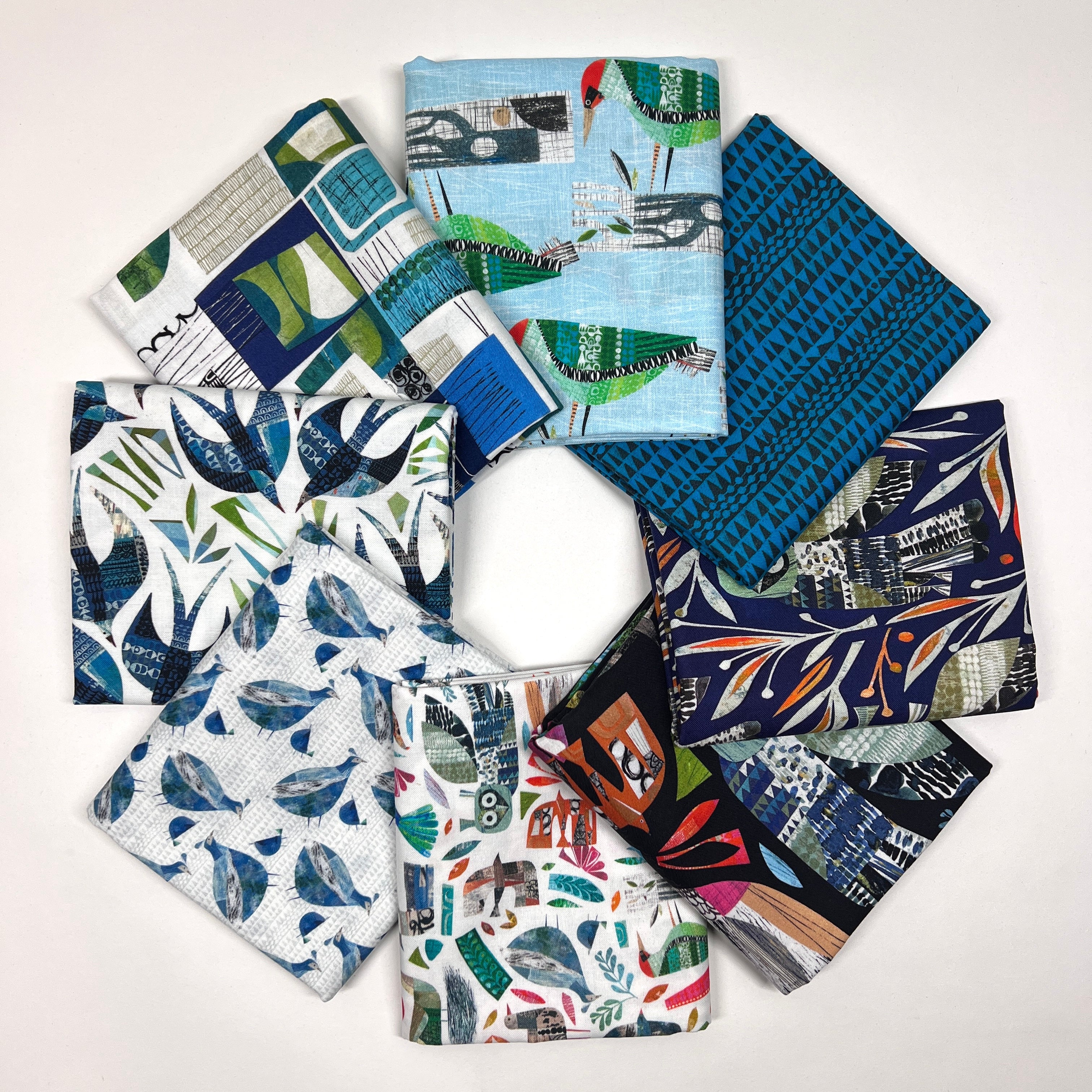 Bold, playful, and full of movement, Flying South by Clare Youngs for FreeSpirit Fabrics is a vibrant collection inspired by migration, nature, and the joy of exploration. This 8 piece half yard bundle features striking bird motifs, layered textures, and expressive botanical shapes in a rich palette of blues, teals, navy, crisp white, and lively pops of green and warm accents.