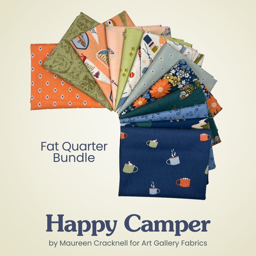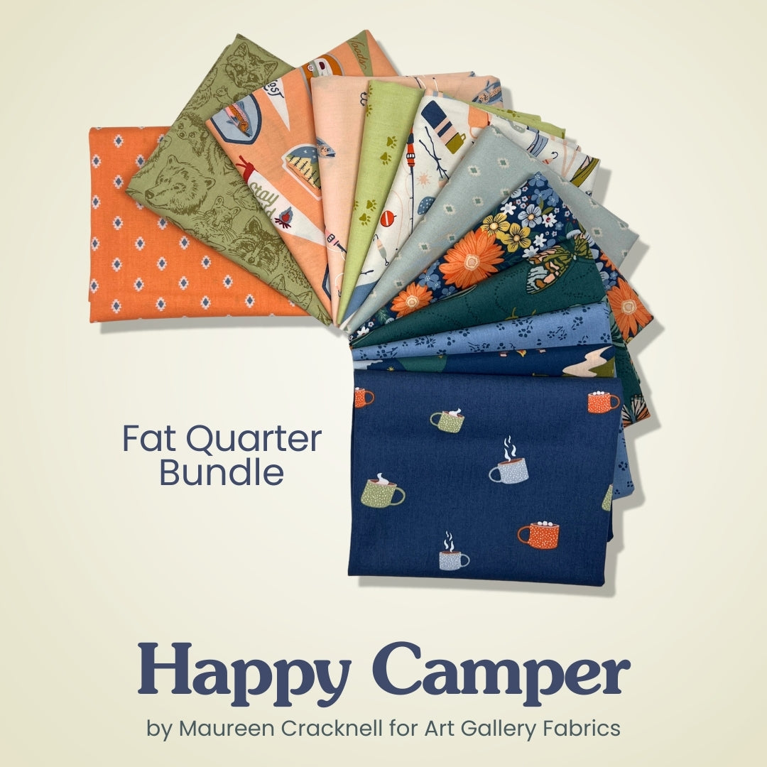 Pack up the fun and head outdoors with Happy Camper, a cheerful fabric collection by Maureen Cracknell for Art Gallery Fabrics. This 12-piece fat quarter bundle is full of playful illustrations and soft, modern colors inspired by camping adventures, road trips, and life under the open sky.