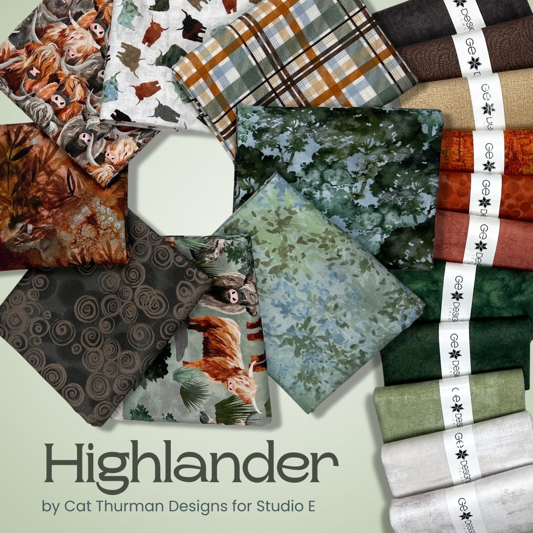 Bring the rugged beauty of the Highlands to your next quilting or sewing project with Highlander, a striking fabric collection by Cat Thurman for Studio E Fabrics. This 10-piece half-yard bundle is rich with earthy tones, woodland textures, and rustic motifs that feel both cozy and adventurous.
