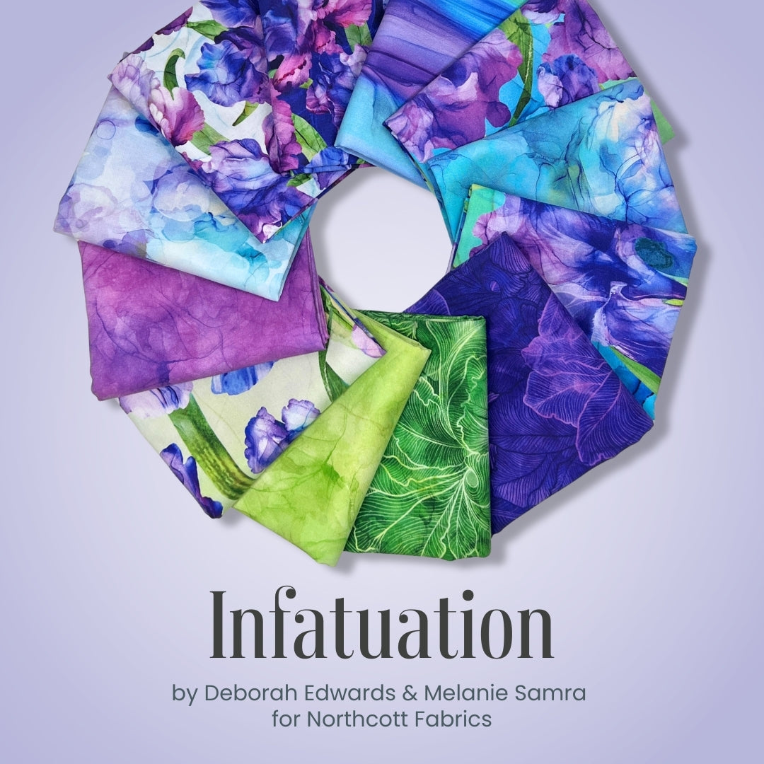 Fall in love with color and movement in the Infatuation collection by Deborah Edwards and Melanie Samra for Northcott Fabrics. This stunning 12 piece half yard bundle features luminous florals, flowing textures, and rich jewel tones in purples, blues, teals, and fresh pops of green. The designs have a soft, painterly quality that feels elegant, expressive, and full of depth.