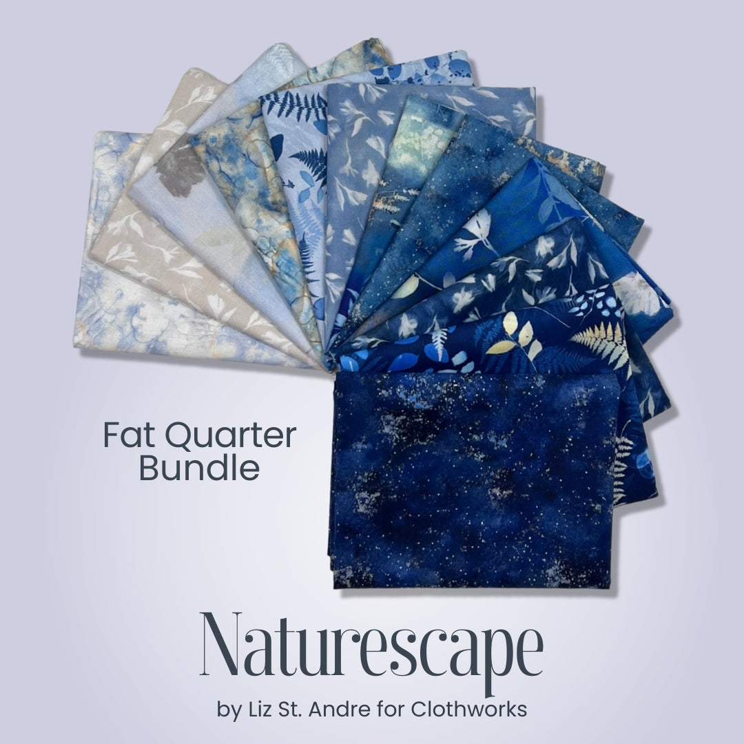Bring the calm beauty of the natural world into your next quilt with Naturescape, a stunning fabric collection designed by Liz St. André for Clothworks. This 12-piece fat quarter bundle features a soothing palette of blues, soft neutrals, and organic motifs inspired by leaves, branches, textures, and quiet landscapes.