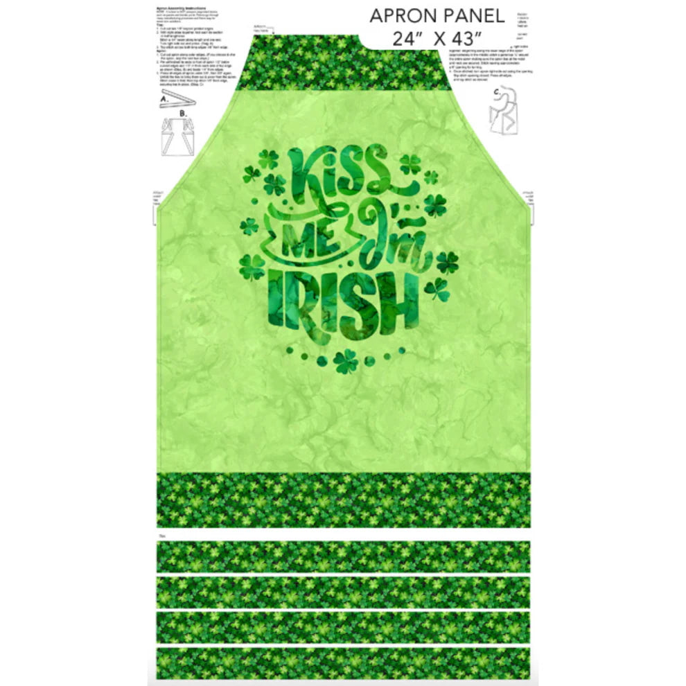 Celebrate a little Irish charm with the Shenanigans Apron Panel by Deborah Edwards and Melanie Samra for Northcott Fabrics. Featuring vibrant shades of green, playful shamrocks, and the fun phrase “Kiss Me I’m Irish,” this apron panel is perfect for festive cooking, baking, or gifting—especially around St. Patrick’s Day.