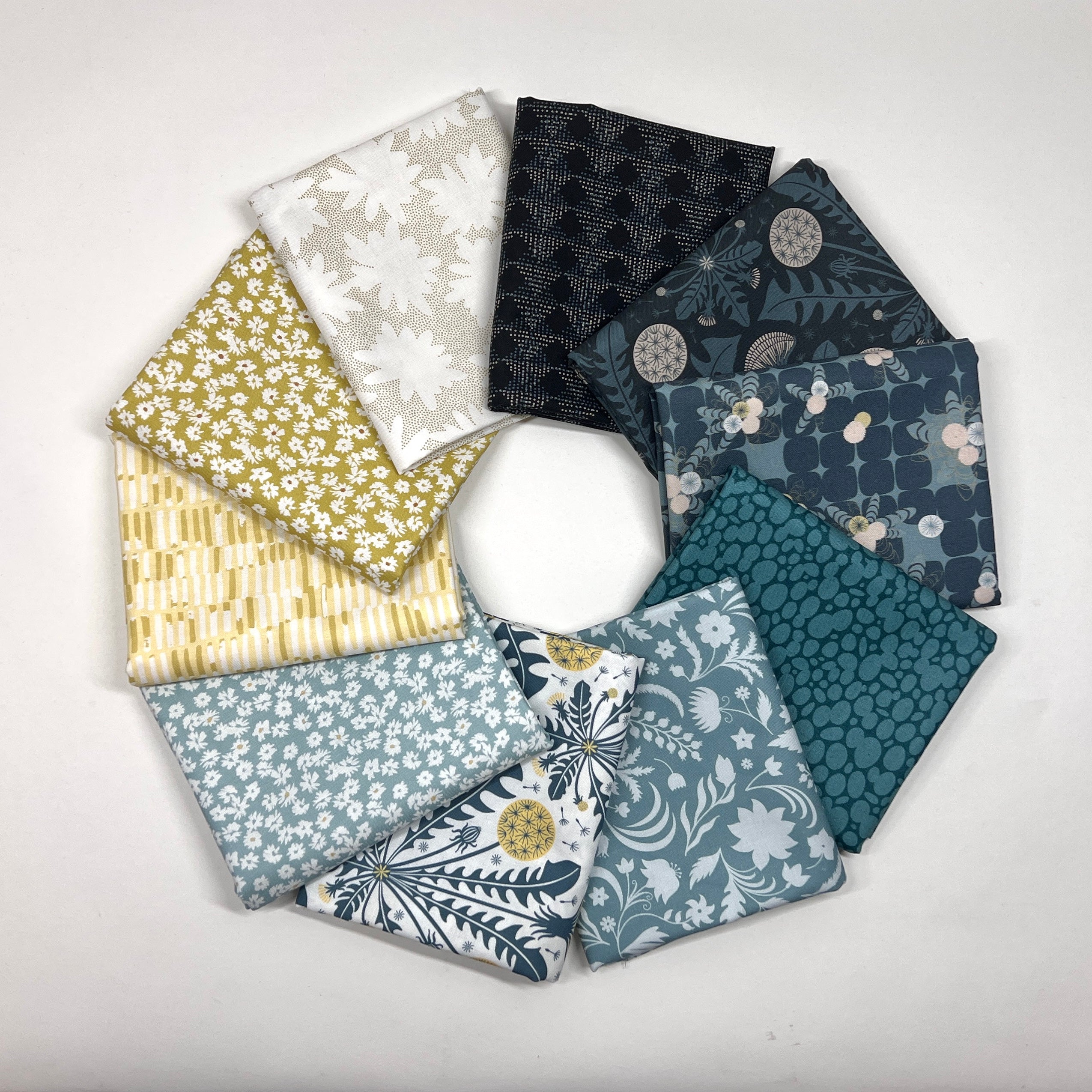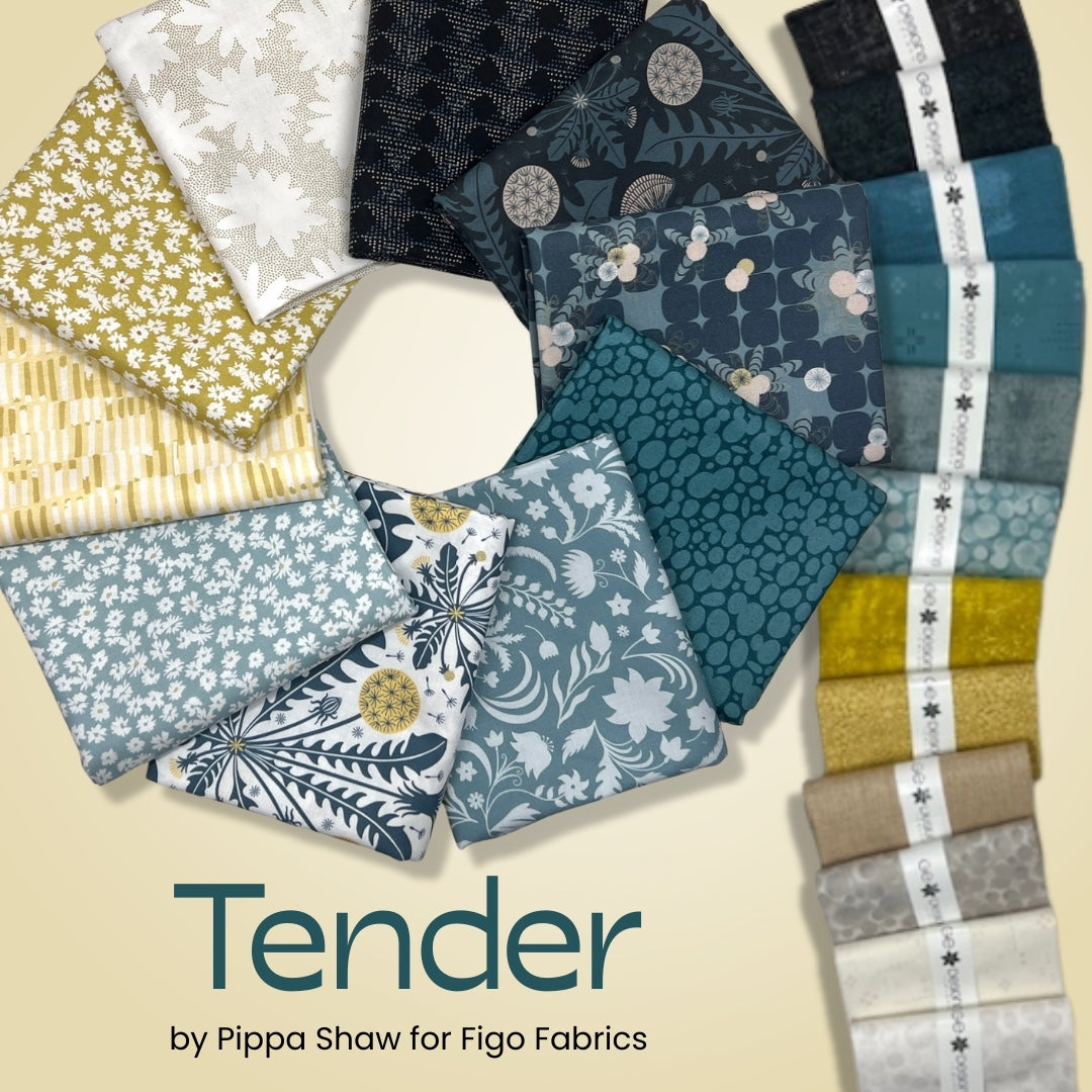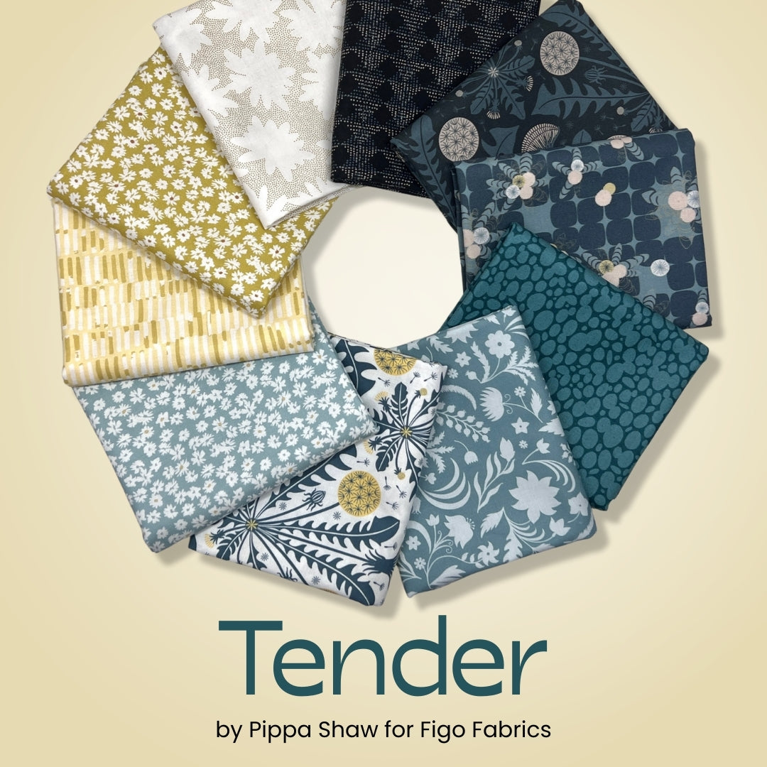 Soft, serene, and beautifully balanced, Tender by Pippa Shaw for Figo Fabrics is a timeless collection inspired by quiet moments and organic beauty. This 10 piece half yard bundle features a soothing palette of teal, blue-grey, soft white, navy, and warm golden accents, paired with delicate florals, textured geometrics, and graceful botanical motifs.