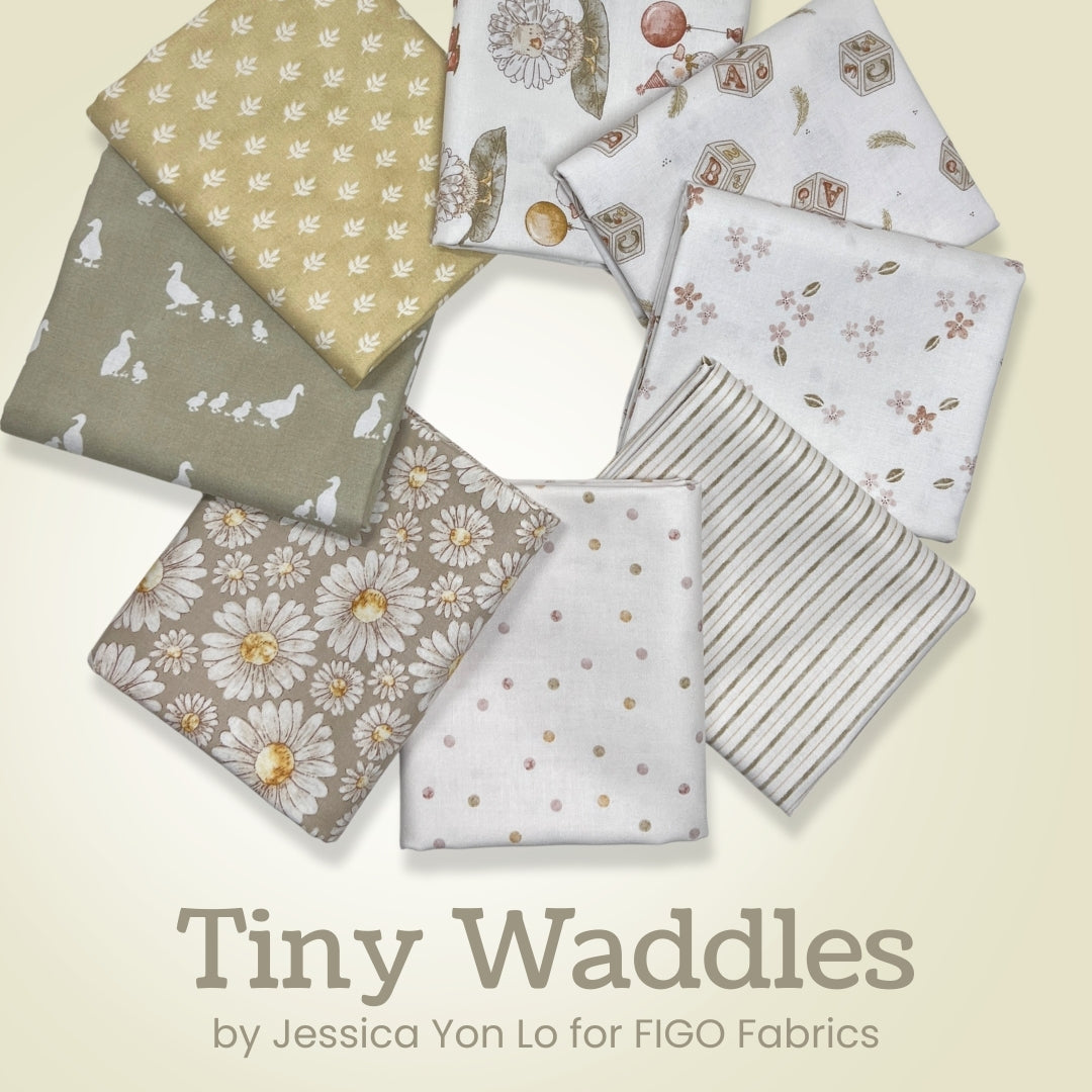 Sweet, soft, and full of charm, Tiny Waddles by Jessica Yon Lo is a delightful collection that brings gentle whimsy to your sewing projects. This 8 piece half yard bundle features a soothing neutral palette of warm creams, soft taupes, sage greens, and blush accents, paired with playful motifs like waddling ducks, delicate florals, subtle dots, and classic stripes.