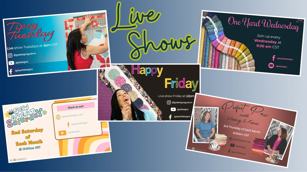 Join us three times a week for our live shows on Youtube and Facebook. Gudrun and her team showcase their favorite fabrics, designs, and cocktails. Join the whole community - we're a friendly bunch!