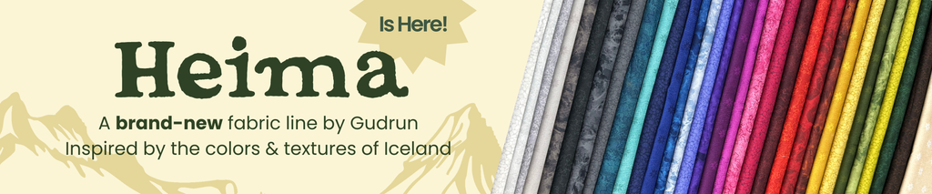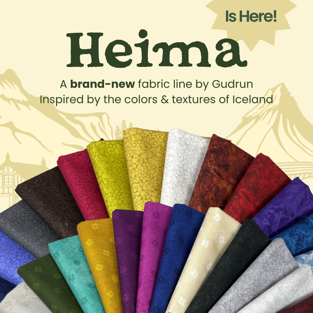 Experience Gudrun's taste of home with Heima, a breathtaking fabric collection by Gudrun Erla for Andover Fabrics. Rooted in the Icelandic word "Heima," meaning "home," this collection draws inspiration from the natural beauty and textures of Iceland, including glacier blues, mossy greens, and the intricate patterns of traditional knits.