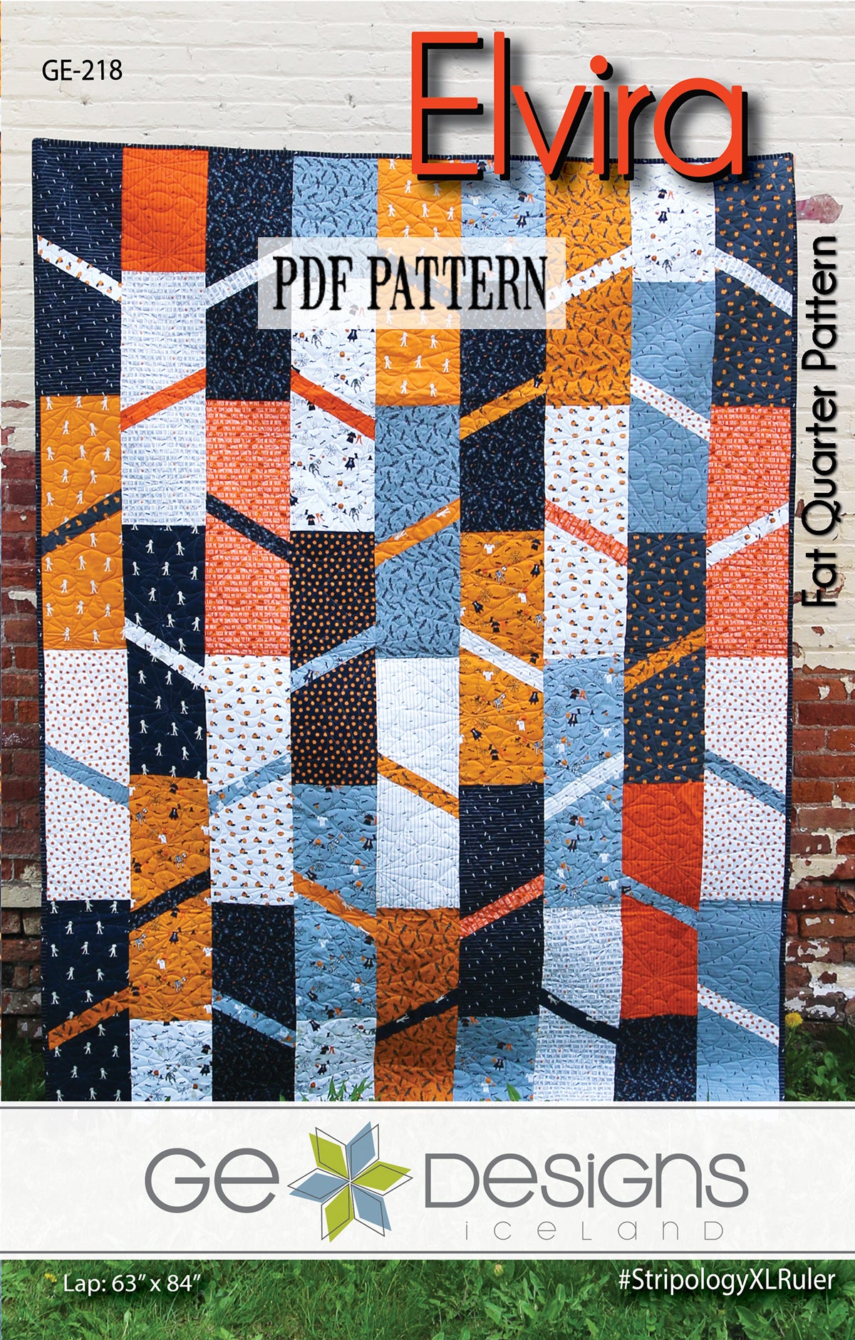 Elvira is a fun and fast to make quilt from fat quarters. Construction is very easy with the Stripology XL ruler by GE Designs and the GEasy point trimmers. Instructions for using regular rulers are included. The pattern comes with 4 different size options: crib, lap, full, queen.