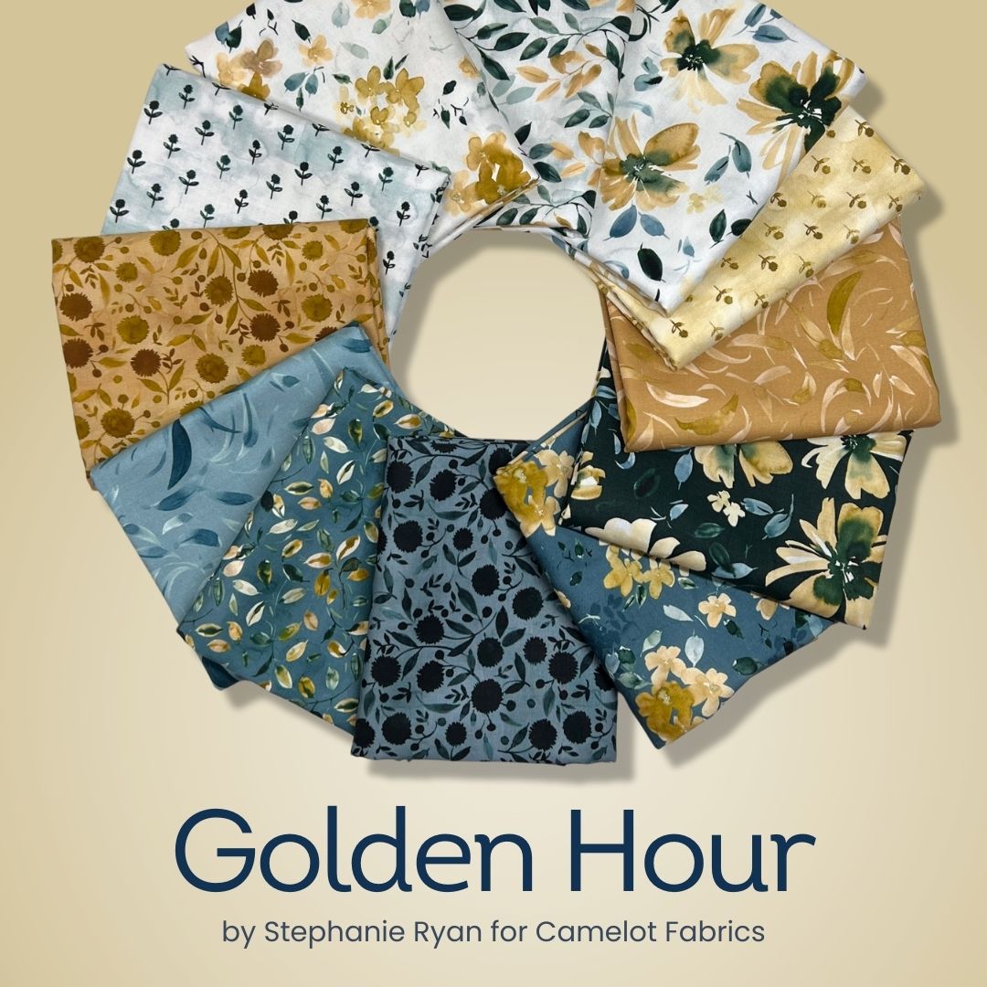 Bring warmth, elegance, and a touch of nature into your next project with the Golden Hour collection by Stephanie Ryan. This curated 12-piece half-yard bundle features a beautiful balance of soft florals, leafy prints, and subtle textures in a harmonious palette of golden honey, deep teal, soft blue, ivory, and forest green.