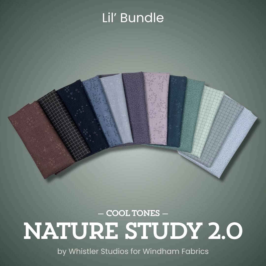 The Nature Study 2.0 Lil' Bundle includes 12- 6"x21" cuts of fabric from the Nature Study 2.0 collection by Whistler Studios for Windham Fabrics to create any GE Designs Lil' Table Runner. The lil bundle does not include fabric for 1/4 yard of binding.