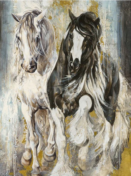 Celebrate the majesty and motion of equine beauty with Pedigree, a stunning fabric panel by Canadian artist Elise Genest for Northcott Fabrics. This captivating panel features two powerful horses - one deep chestnut-black, the other ivory-white - rendered in Genest’s signature painterly style that blends realism with expressive brushwork.