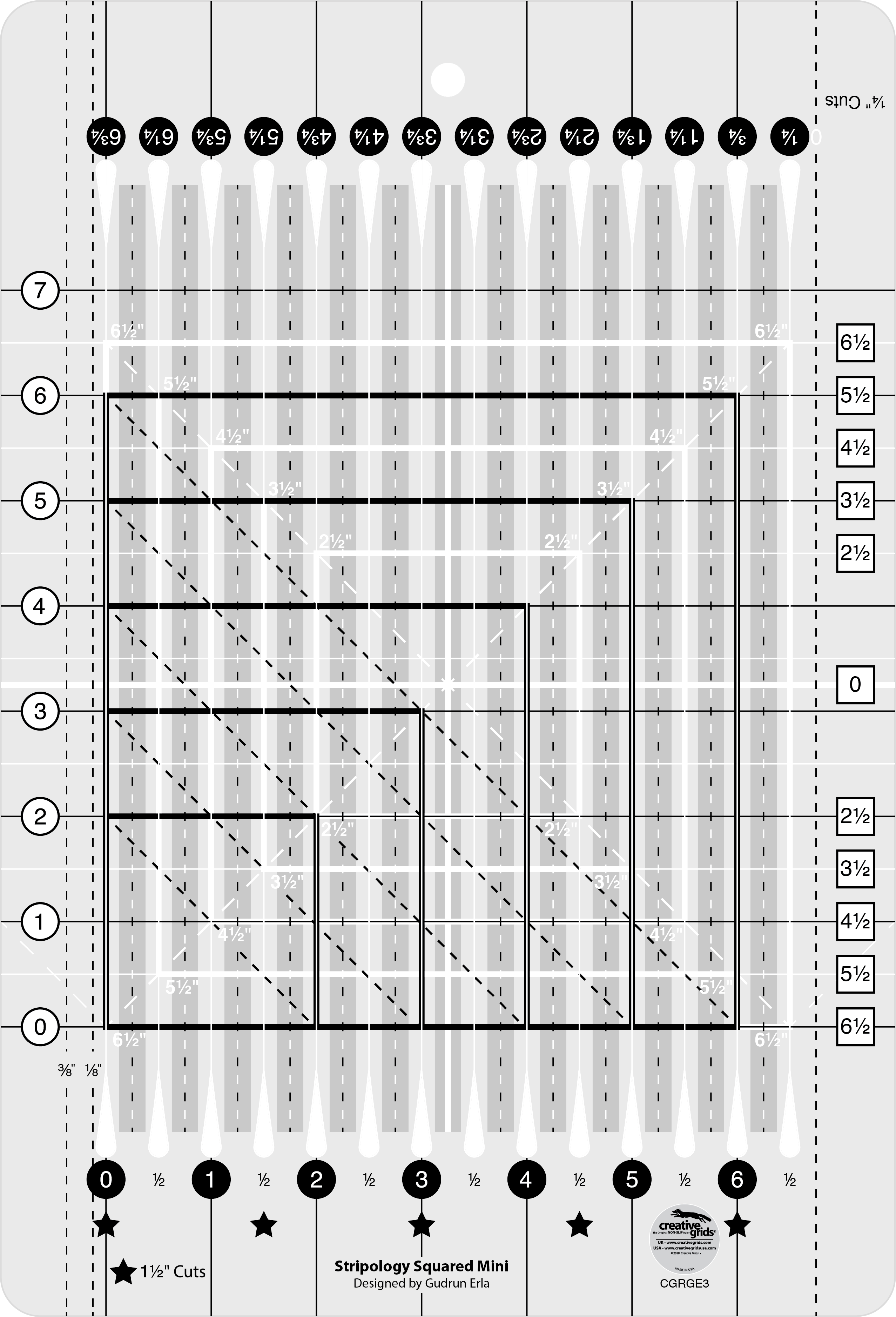 This is the tool that changes everything. Designed by Gudrun Erla, the Stripology Squared Mini Ruler makes cutting faster, easier, and more precise—so you can spend more time quilting, less time prepping. With the Stripology Ruler, you will replace 90% of your rulers and cut up to 75% faster.